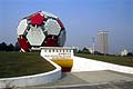 球形建筑艺术馆里面陈列着大连各种建筑图形,因为大连是足球城,所以它的外形便造成了红白相间的球体。球体直径19.6米,高21米。