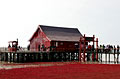 红海滩码头是一处在滩涂上建起的纯木制仿古旅游景观,全长1000余米的两座蜿蜒的九曲廊桥蜿蜒伸入海中,两条“九曲廊桥”自岸边直探进海中,沿着木栈道走走停停,大概半个小时就可以完成,在那么空旷的地方,远眺“红海”蓝天一线相接,心情会象天空的蓝色一样好。红海滩码头还是世界上唯一一处在泥滩上建起的纯木结构的仿古建筑群,妈祖庙和木栈道一样,当然都是为了开发旅游而修建的。在妈祖庙后面的平台的,有几个丹顶鹤——雕塑,主要是为了美化环境和给游人留影用的。站在栈道上远望这由万亩火红的碱蓬草织就的天赐美景,在领略自然美景的同时,再钓几个小蟹子,别有一番情趣。织就红海滩的是一颗颗纤柔的碱蓬草,学名叫翅碱蓬,由于土质的原因,碱蓬草出土的时候就是红色的,随着季节的生长,会越长越红。草底下都是湿泥,有好多好多小蟹子洞。